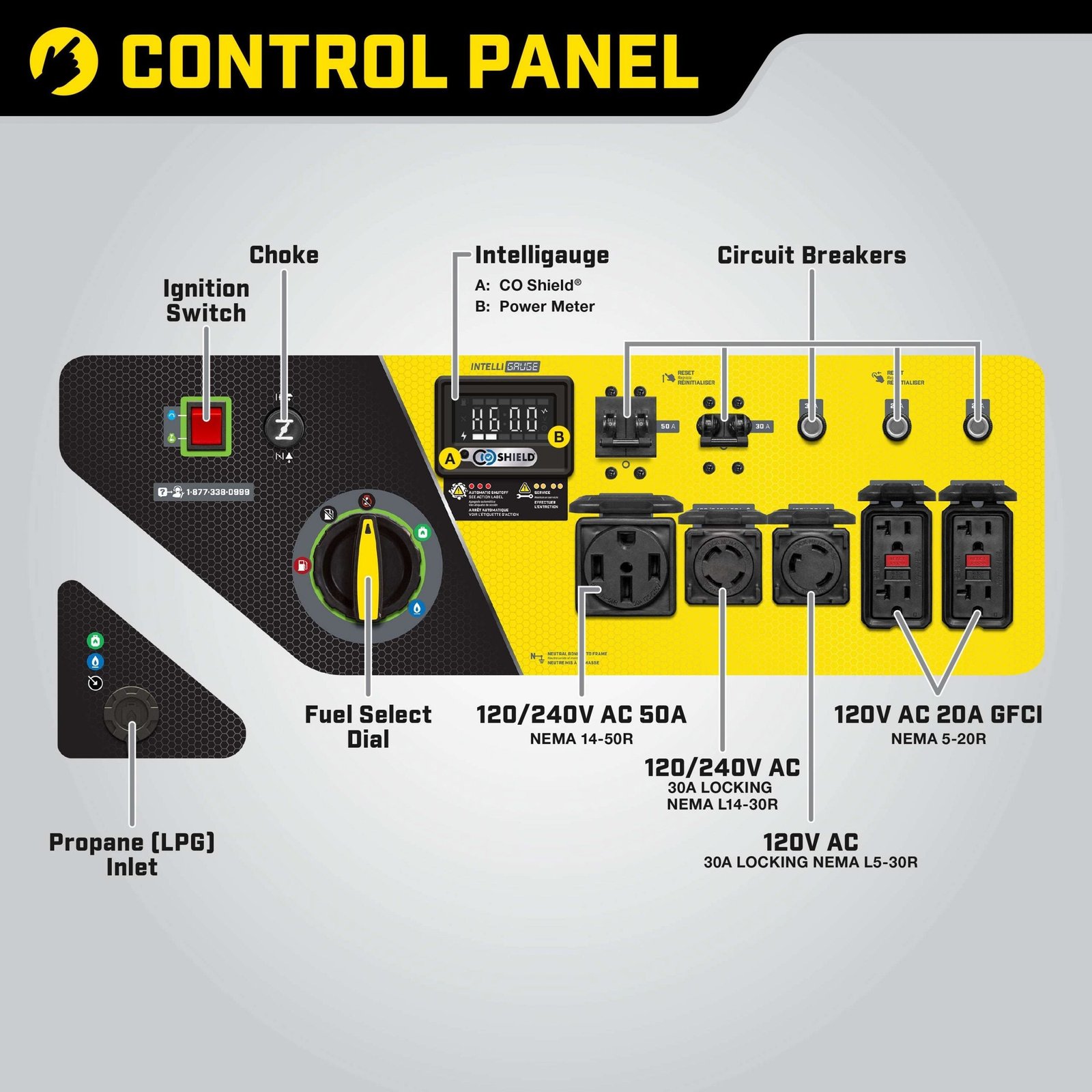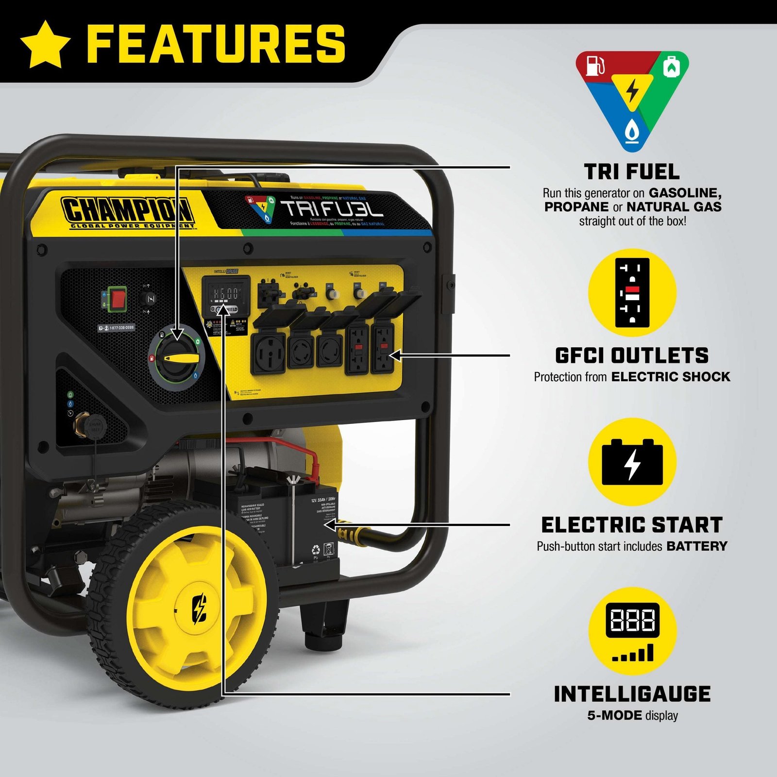 Our powerful 12,000-watt generator features CO Shield® carbon monoxide auto shutoff system. Also operating on Tri-Fuel technology, allowing it to run on natural gas, gasoline, or propane. The massive 717cc Milwaukee Series V-Twin Engine with battery-included electric start features Intelligauge and has all the power you need and more for home backup during an outage or your next project.