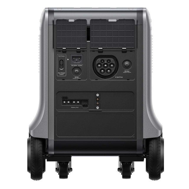 Combining AC and solar power, SuperBase V can charge up to 5,150W on its own, or 6,600W when connected to a Satellite Battery. Whether you’re planning for an emergency or using SuperBase V to manage your household energy consumption, faster is always better.SuperBase V can charge up to 3,000 W using solar power alone. This is enough to fully charge the main unit in 2 to 3 hours. While we offer our own solar panels, SuperBase V is compatible with a wide range of other manufacturers’ solar panels from 12V to 150V and can be easily integrated into your existing solar system. You can charge SuperBase V from a 120V or 240V outlet AC. At 240V, SuperBase V can draw 3,600W at its AC input and recharge in about 2 hours.